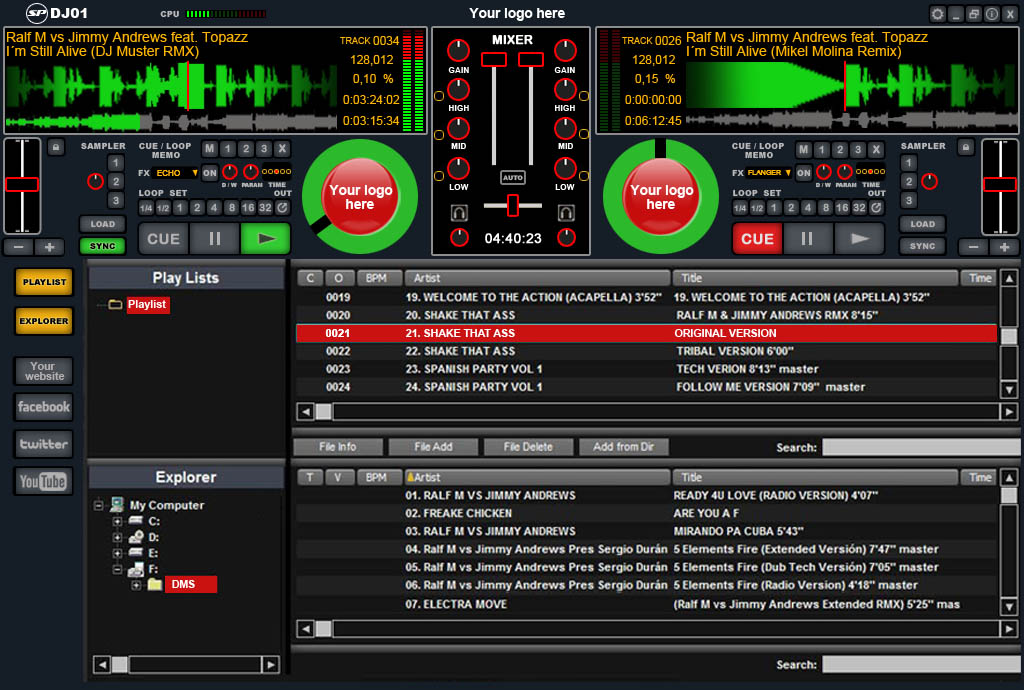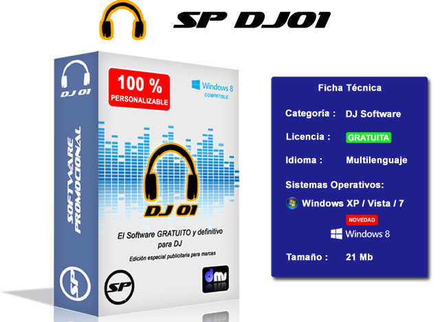 Además de disponer de botones de acceso a redes sociales y links directos a la web de la marca SP, el DJ01 es un DJ software Profesional para Windows, es el programa para DJ completamente funcional y gratuito.